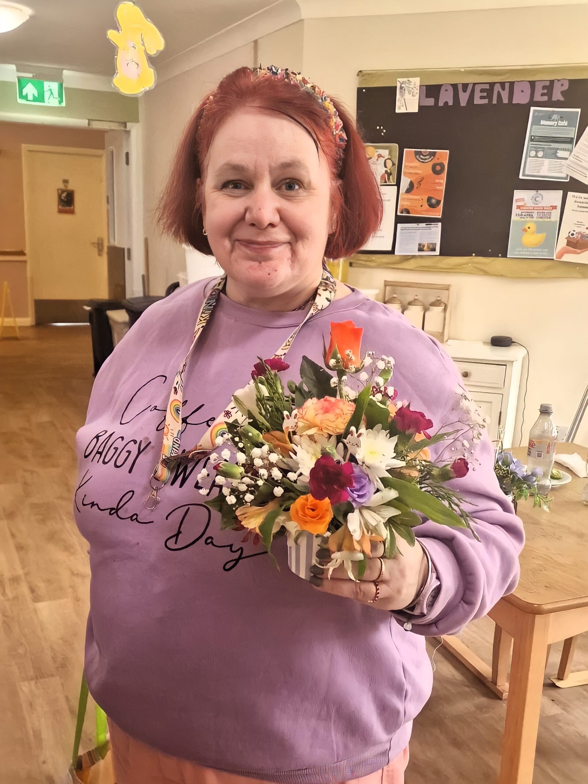 Our Wellbeing Coordinator, Sam, welcomed Jenny, a resident’s family member, who kindly donated all the flowers and materials for the activity.