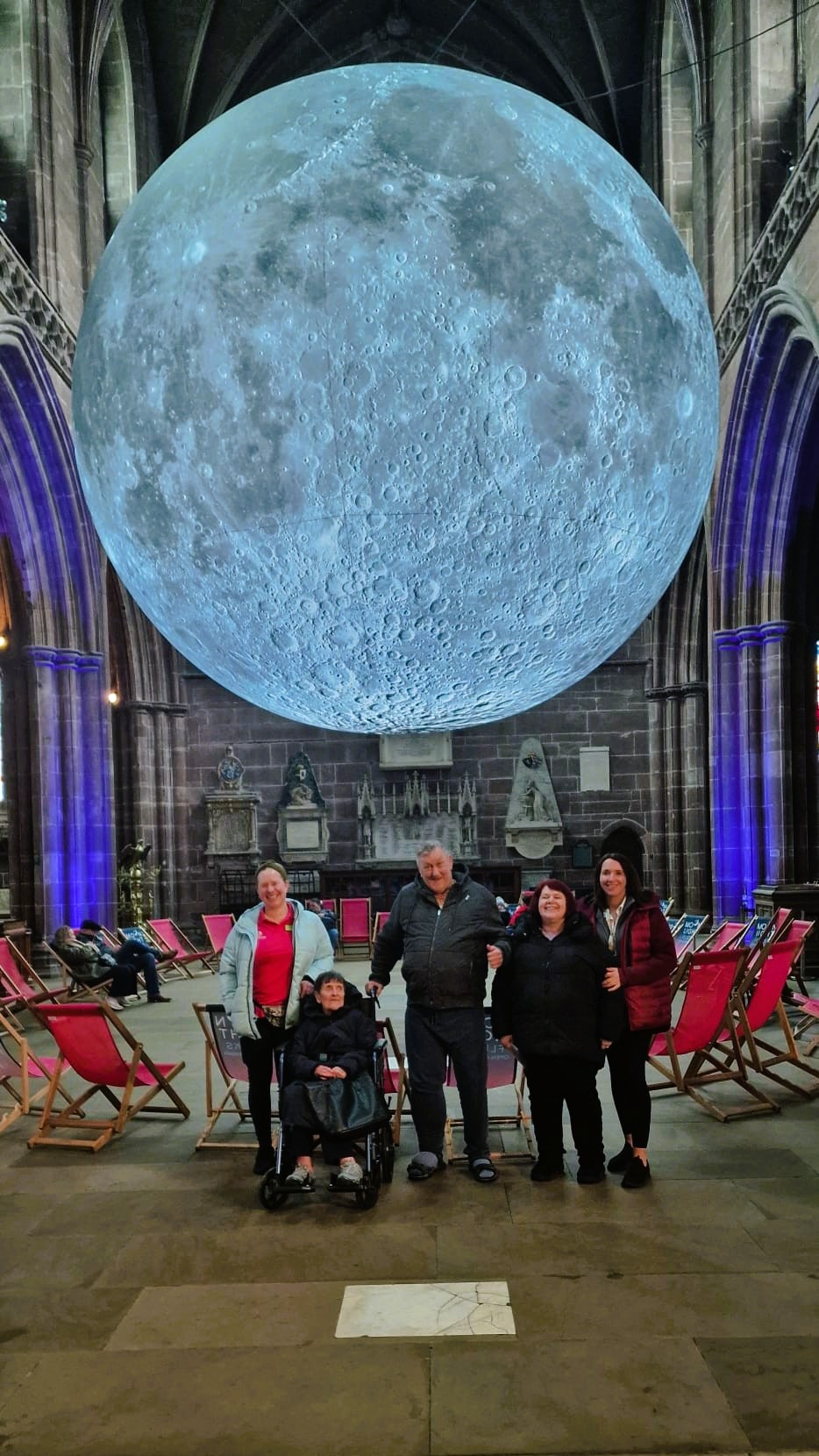 Experiencing the giant glowing Moon at Chester Cathedral was a soothing and memorable experience for our Residents from Lavender Villa. It was wonderful to see this beautiful artwork by Luke Jerram, paired with the calming soundscape by Dan Jones.