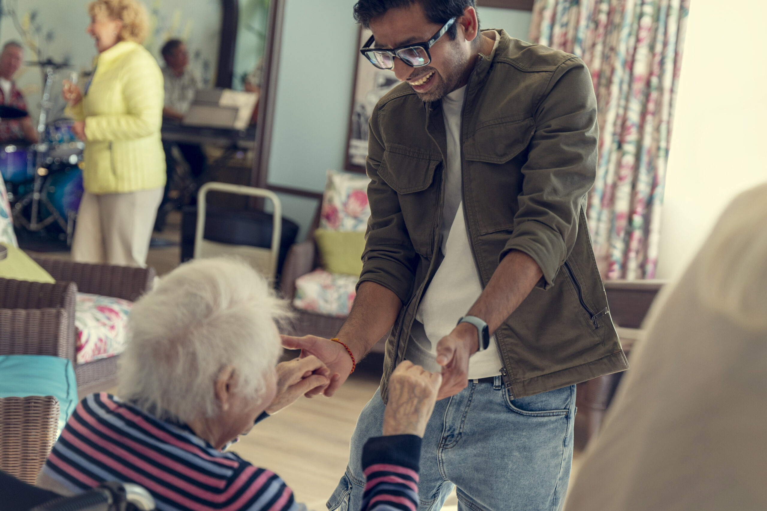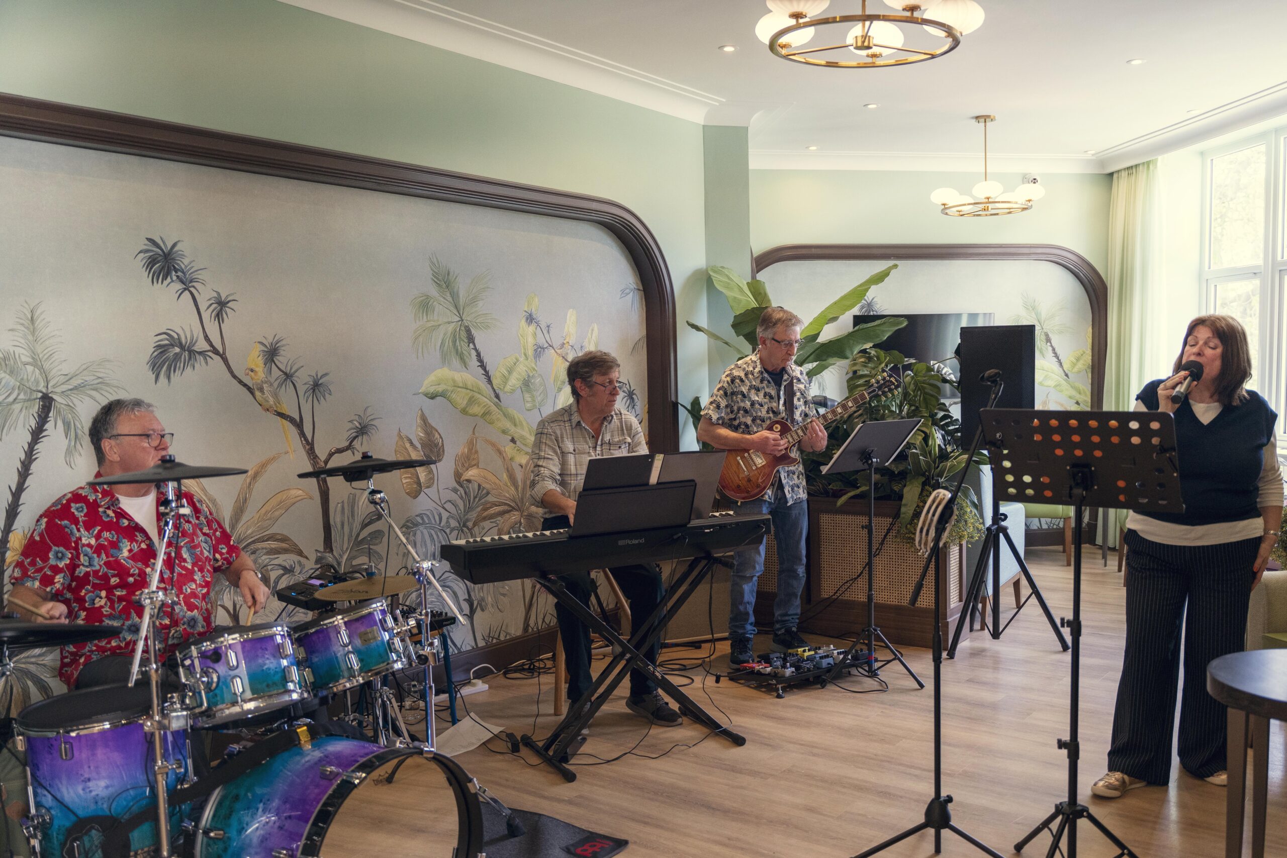 Residents and our guests came together to enjoy a wonderful afternoon , accompanied by a live jazz band . Friends and family shared a delicious afternoon tea , creating a warm and lively atmosphere throughout the home.